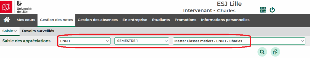 Si vous intervenez dans plusieurs promotions ou plusieurs cours, vous pouvez changer via les filtres :